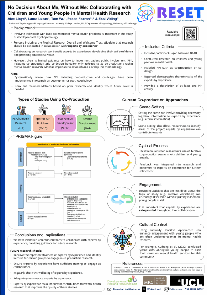 - Lloyd, A., Law, R., Midgley, N., Lucas, L., Wu, T., Viding, E., Fearon, P. (2025). Co-Producing an Interdisciplinary, Preventative Mental Health Intervention: Development of the Building Resilience through Socioemotional Training (ReSET) Programme. Advances in Mental Health, 1-17.